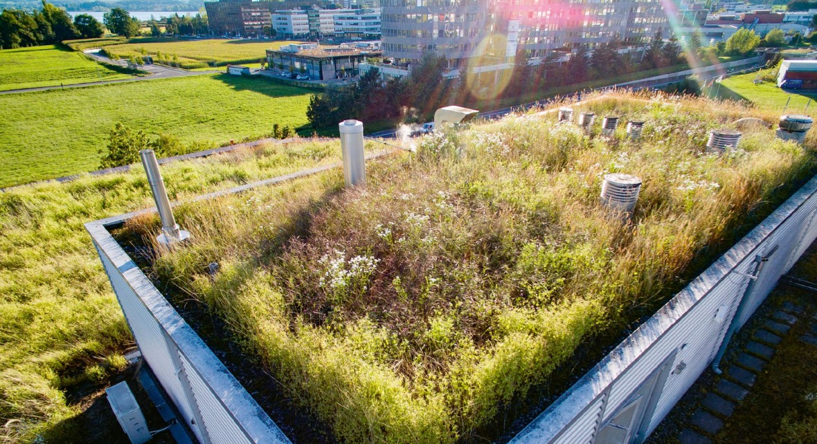 Beide Grundtypen der Dachbegrünung funktionieren als «Naturbodenersatz»: Sie kompensieren durch den Bau verloren gegangenes Terrain und übernehmen dessen Funktionen. So haben sie beispielsweise die Fähigkeit, Regenwasser aufzunehmen und für sich zu nutzen, anstatt es an die Kanalisation weiterzuleiten. Dadurch erfolgt eine Entlastung der lokalen Abwassersysteme, was die entsprechenden Abgaben an die Gemeinde verringern kann. Diese Rückhalte-Eigenschaft ist hoch willkommen, denn versiegelte Flächen, seien es konventionelle Dächer oder Asphaltbeläge auf Strassenniveau, erhöhen die Ansprüche an das Fassungsvermögen der Kanalisation. Oberflächen, die kein Wasser absorbieren können, reflektieren auch die Strahlen der Sonne. Deshalb ist an Orten, wo sie besonders gehäuft vorkommen, die Umgebungstemperatur nicht selten um einige Grad höher als in Gegenden mit einem niedrigen Anteil an versiegelten Böden. Besonders in den Städten ist deshalb eine Erhöhung der Gebäudebegrünung zur Regulierung des Aussenklimas und auch zur Bindung von Feinstaub und CO2 sehr willkommen.