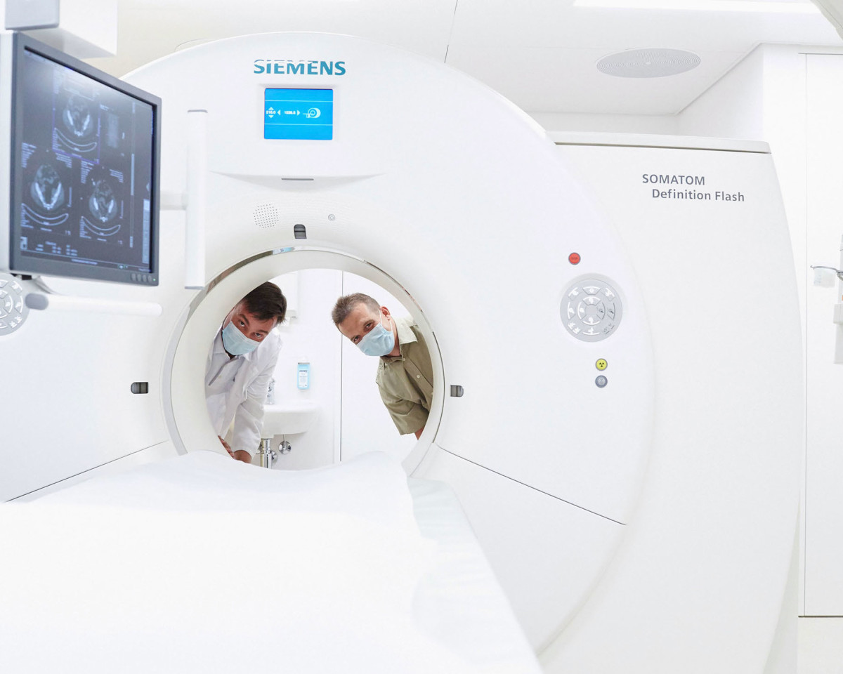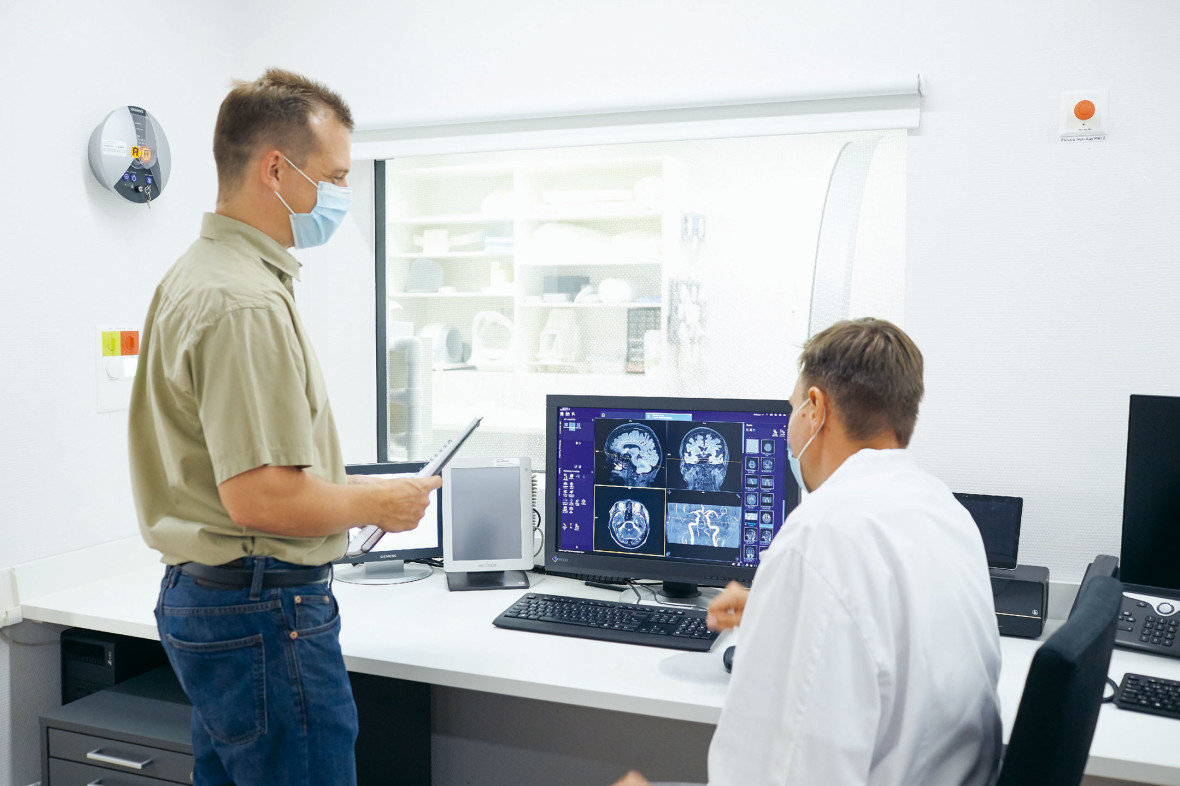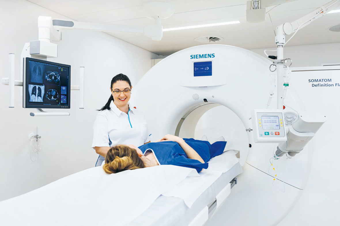 Das Herzstück der umgebauten Radiologie befindet sich im hinteren Teil der Station: Das Magnetresonanzgerät (MR) sowie der Computertomograf (CT), mit deren Hilfe die Ärzte Bildmaterial vom Zustand der Organe oder des Gewebes anfertigen können. Insbesondere der Einbau des MR, das rund 2,3 Meter hoch ist und durch keine der bestehenden Türen und Fenster passt, erwies sich als echte Knacknuss. Quo vadis? Die Lösung lieferten schliesslich die Bauspezialisten der Alfred Müller AG: Erdwall abtragen, Aussenfassade entfernen, MR mit dem Kran hineinhieven, Aussenfassade wieder anbringen und abdichten. Ein nicht alltägliches Spektakel, das sich da abspielte. Kaum war dieser Koloss platziert, standen Urs Polli und sein Team vor der nächsten Herausforderung. Aufgrund von Lieferschwierigkeiten fehlte die Kühlanlage, was die Inbetriebnahme des MR verunmöglichte. Die dafür gebuchten Spezialisten des Herstellers hatten mit ihren prall gefüllten Auftragsbüchern nur ein kurzes Zeitfenster zur Verfügung. Eine Verschiebung dieses Arbeitsschrittes war daher von Beginn weg ausgeschlossen. An dieser Stelle kommt wieder die Flexibilität Pollis ins Spiel, die in seiner Funktion unabdingbar ist. Er liess sich nicht aus der Ruhe bringen, suchte fieberhaft nach einer rasch umsetzbaren Lösung und überbrückte die Zeit kurzerhand mit einem provisorischen Kühlgerät. Das MR konnte so planmässig installiert werden und der Umbau wieder seinen gewohnten Lauf nehmen.