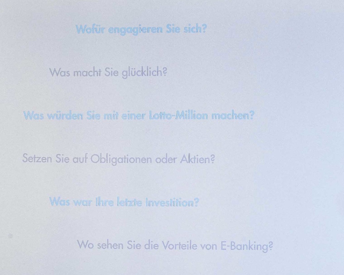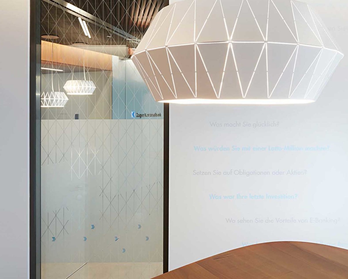 Betritt man die Geschäftsstelle der Zuger Kantonalbank in Rotkreuz, sticht die stilsichere Einrichtung sofort ins Auge. Die Atmosphäre ist angenehm, man spürt, dass bei der Planung und Umsetzung des Ausbaus nichts dem Zufall überlassen wurde. Ausgewählte Details ziehen sich wie ein roter Faden durch alle Räumlichkeiten. «Was macht Sie glücklich?», «Setzen Sie auf Aktien oder Obligationen?», «Wofür engagieren Sie sich?» Betritt ein Kunde ein Besprechungszimmer, blickt er auf diverse solcher Fragen. Sie schmücken die Wand und beziehen sich nicht nur aufs Kerngeschäft der Zuger Kantonalbank. Sie lassen den Betrachter schmunzeln, bringen ihn zum Nachdenken und erinnern ihn dennoch daran, weshalb er hier ist.