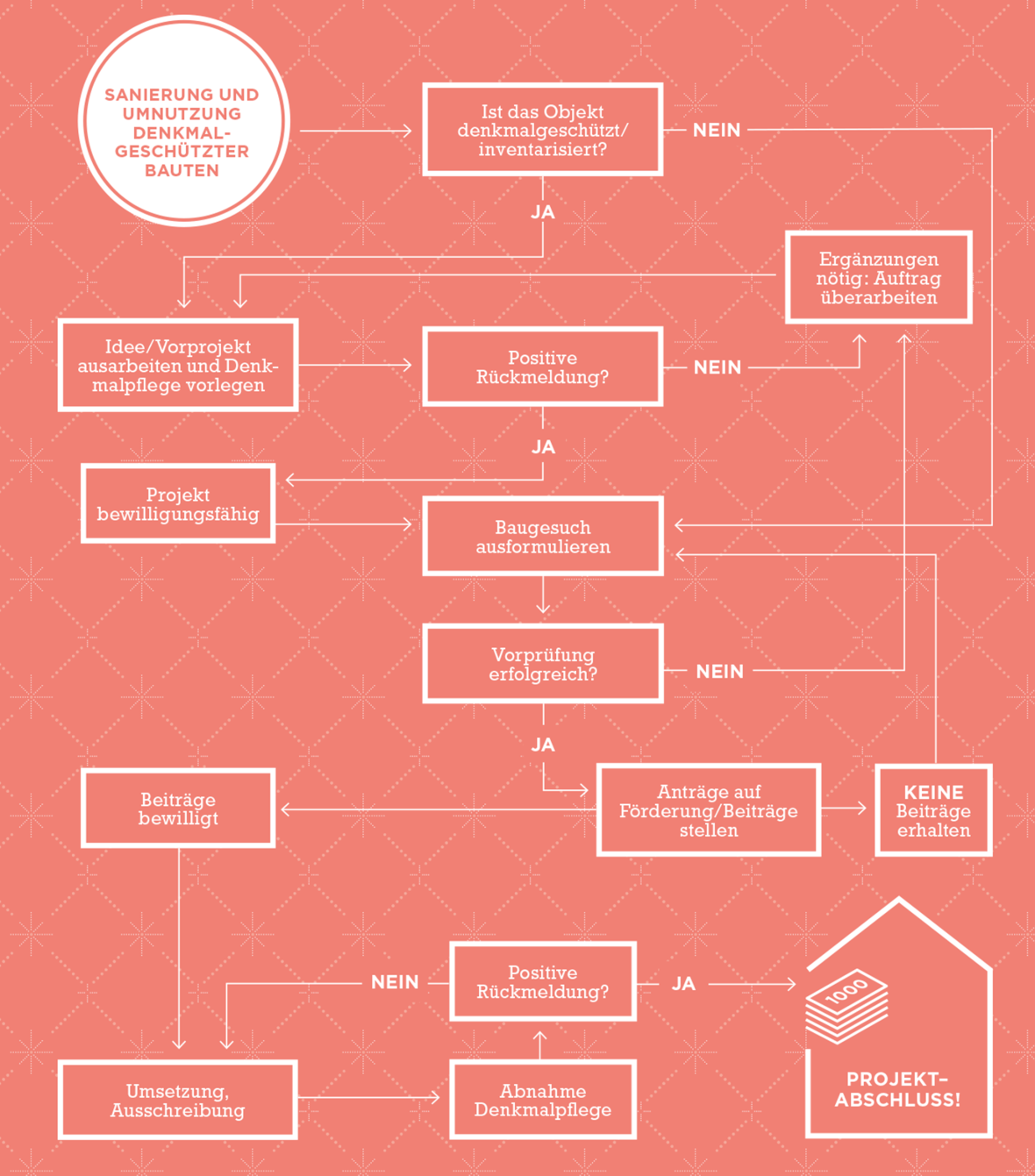 Stehen in geschützten Liegenschaften Umnutzungen oder Erneuerungsarbeiten an, sollten die Bauherrschaften ihre Pläne bereits im Vorfeld mit der Denkmalpflege abstimmen. So können für das Projekt in Frage kommende Fördermittel und Zuschüsse abgerufen werden. Beiträge werden aber nur an werterhaltende, nicht an wertvermehrende Arbeiten ausgerichtet.