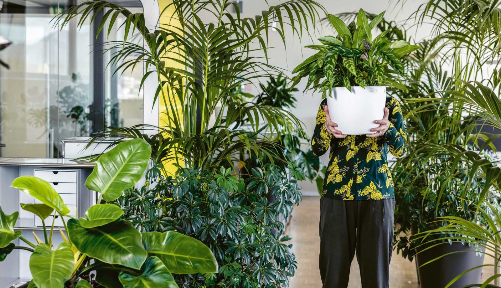 Es gibt über 100 Pflanzenarten, die sich gut eignen und die man kombinieren kann. Verschiedene Variablen spielen dabei eine Rolle. Grundsätzlich muss die Pflanzenauswahl auf die bestehenden Lichtverhältnisse abgestimmt sein. Davon hängt auch die Platzierung der Pflanzen im Raum ab. Natürlich ist es auch eine ästhetische Frage. Idealerweise befin-den sich die Pflanzen in der Nähe der Personen, direkt am Arbeitsplatz. Sie sollten im Blick der Mitarbeitenden sein, um ihre positive Wirkung entfalten zu können.