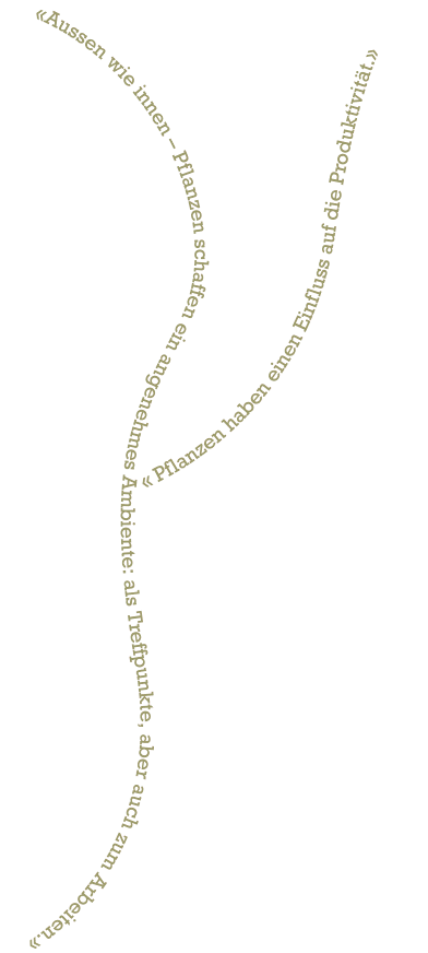 Pflanzen haben definitiv einen Einfluss auf die Produktivität. Sie absorbieren Schadstoffe und erhöhen den Feuchtigkeitsgehalt der Raumluft. Eine höhere Luftfeuchtigkeit bedeutet weniger Kopfschmerzen, Augentrockenheit und Müdigkeit. Es ist bekannt, dass Gebäude, die klimatisch nicht optimal eingestellt sind, Krankheiten und Unwohlsein begünstigen. Dieses Phänomen heisst «Sick-Building-Syndrom». Neben einem gesteigerten Wohlfühlfaktor erhöht sich die Produktivität aber auch durch die Möglichkeit, sich durch den Blick ins Grüne immer wieder zu erholen. Anschliessend ist man wieder aufmerksamer und macht weniger Fehler.