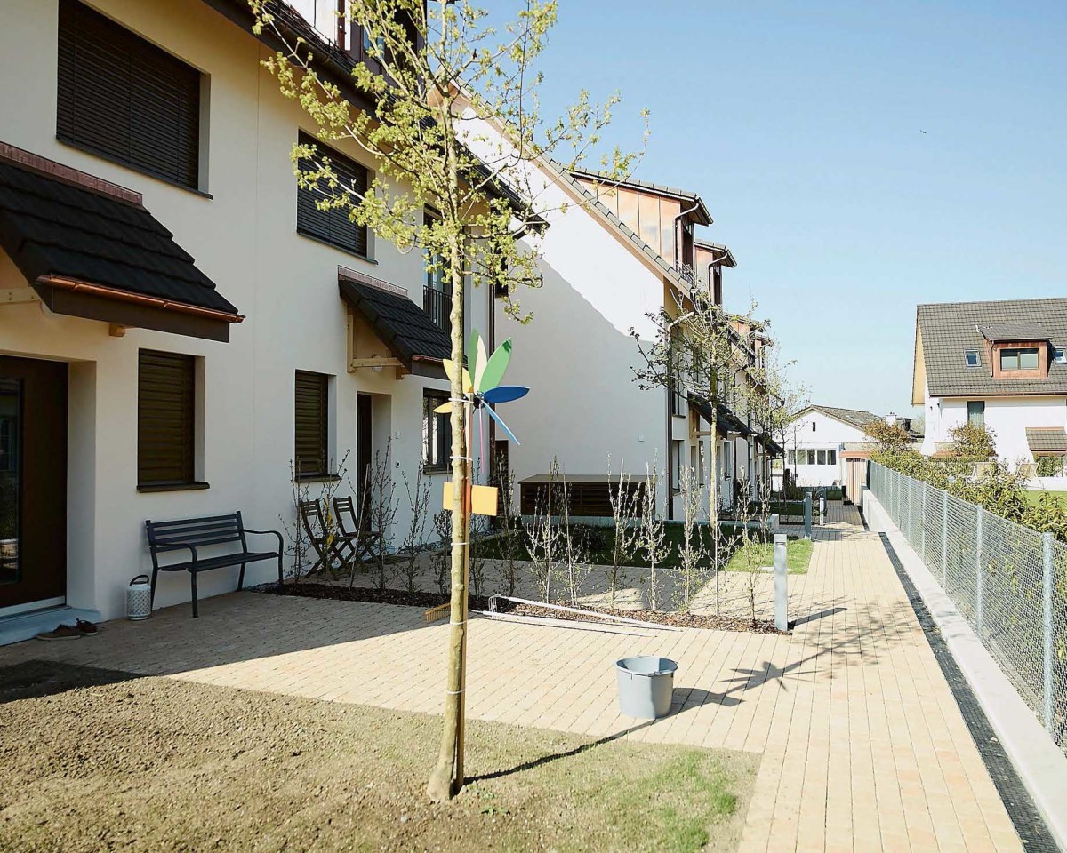 Als Björn Boog die Siedlung mit den Elementbau-Holzhäusern zuletzt besuchte, lag noch überall Schnee. Der frühe Wintereinbruch, lange Nässeperioden, Schneefall und Kälte hatten dem Gartenbauteam der Alfred Müller AG die Arbeiten nicht gerade leicht gemacht. Dennoch konnten sämtliche Umgebungsarbeiten pünktlich zum Bezugstermin im Dezember abgeschlossen werden – bis eben auf den Rasen. «Als Gartenbauer ist man sich gewohnt, bei jedem Wetter draussen zu arbeiten. Das habe ich mir bewusst so ausgesucht, als ich vor zehn Jahren meine Ausbildung zum Landschaftsgärtner bei der Alfred Müller AG begonnen habe», erzählt Boog, der davor die Handelsschule besucht und mehrere Bürojobs ausprobiert hatte, die ihn aber nicht zu packen vermochten. Ganz im Gegensatz zu seiner jetzigen Tätigkeit. «Die Freude am Gärtnerberuf ist mir bisher nicht vergangen.»