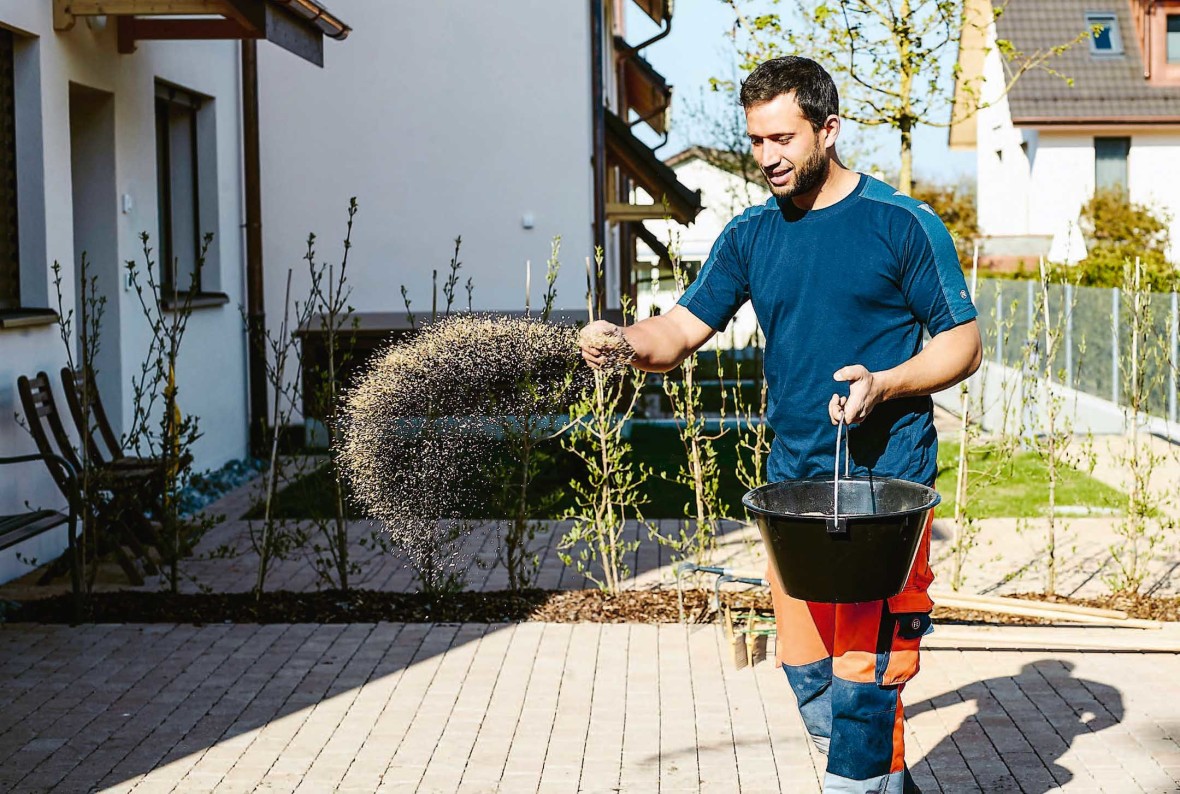 Es ist ein milder Dienstagmorgen Ende April. Der gelernte Landschaftsgärtner und Vorarbeiter bei der Alfred Müller AG, Björn Boog, ist auf dem Weg nach Kappel am Albis. Im Juni 2020 haben der 33-Jährige und sein Team damit begonnen, die Bauherrin der sieben Doppeleinfamilienhäuser, die Nussbaumer Planung AG, bei den Garten- und Tiefbauarbeiten zu unterstützen. Mit der Aussaat des Rasens wird Björn Boog das Projekt heute endgültig zum Abschluss bringen.