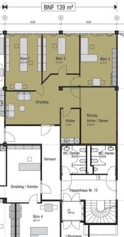 Die ausgebaute Bürofläche im 1. Obergeschoss des Hausteils Riedstrasse 13 von 139 m² umfasst vier Einzelräume sowie eine Teeküche.