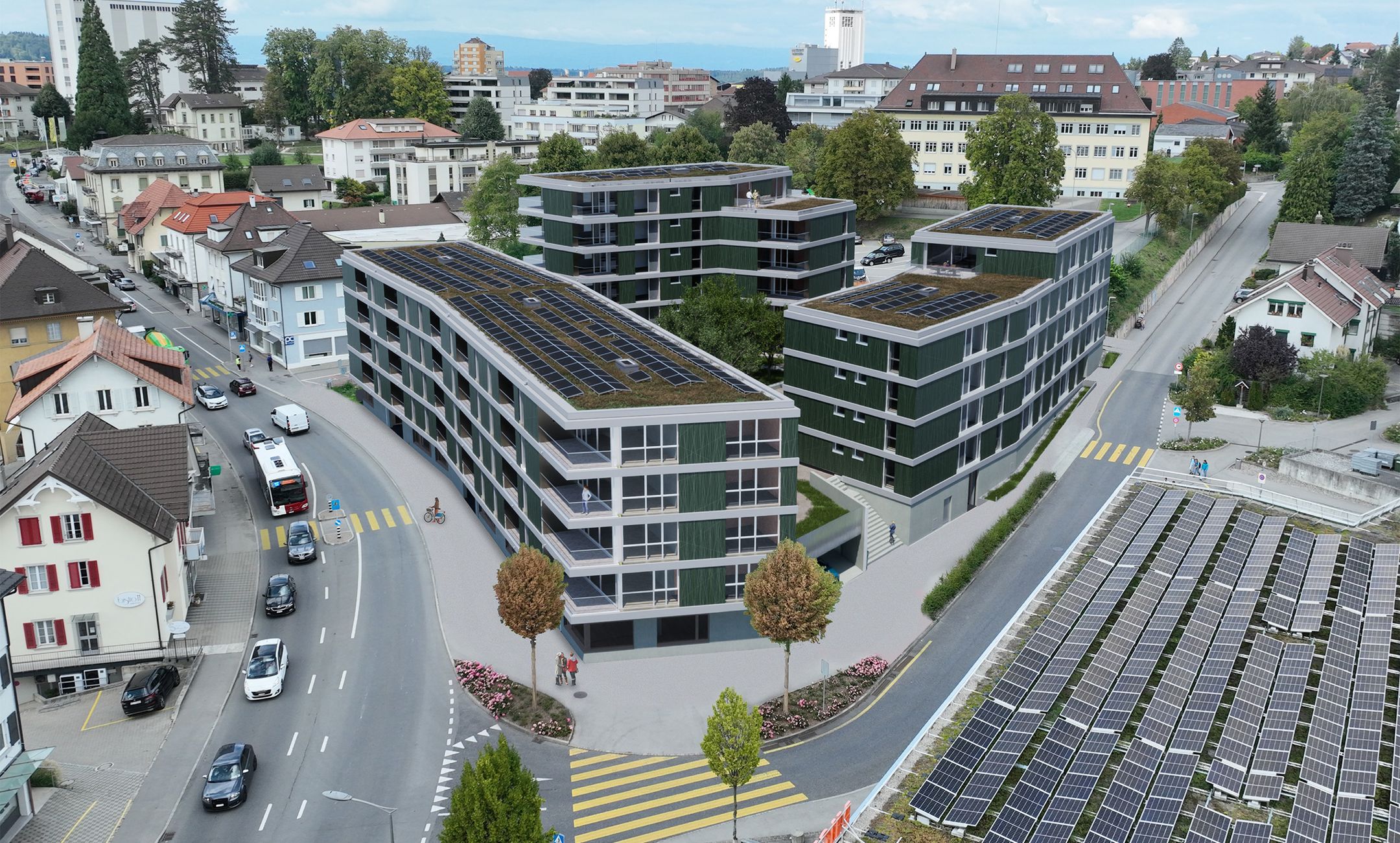 Düdingen mit rund 9000 Einwohnerinnen und Einwohnern liegt im Sensebezirk und gehört zur Agglomeration der Stadt Freiburg. Das Projekt Patio der Alfred Müller AG nutzt die aussergewöhnliche Hanglage des Grundstücks optimal aus.