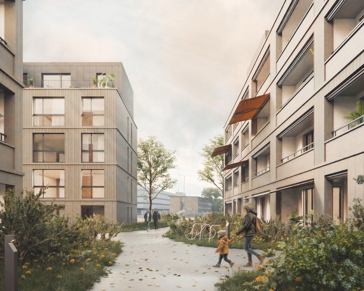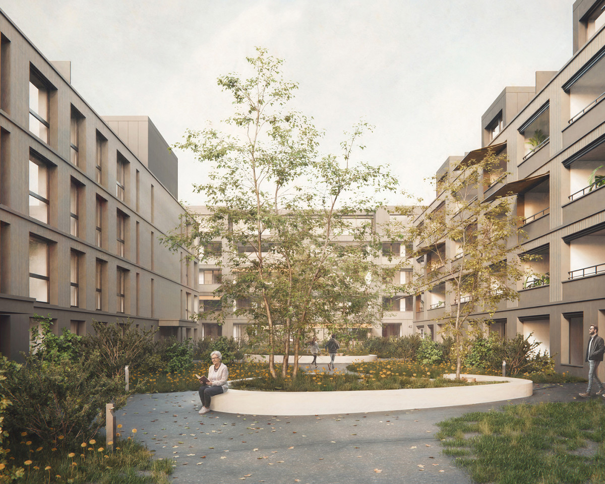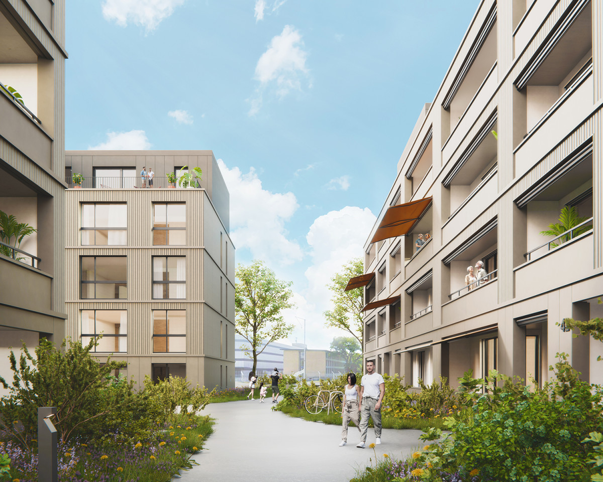 Die geplante Wohnüberbauung der Alfred Müller AG umfasst 3 viergeschossige Gebäude mit insgesamt 95 Mietwohnungen von 1.5 bis 4.5 Zimmern. Die Gebäude sind um einen gemeinsamen Innenhof angeordnet, grosszügige Grünflächen prägen den Standort.