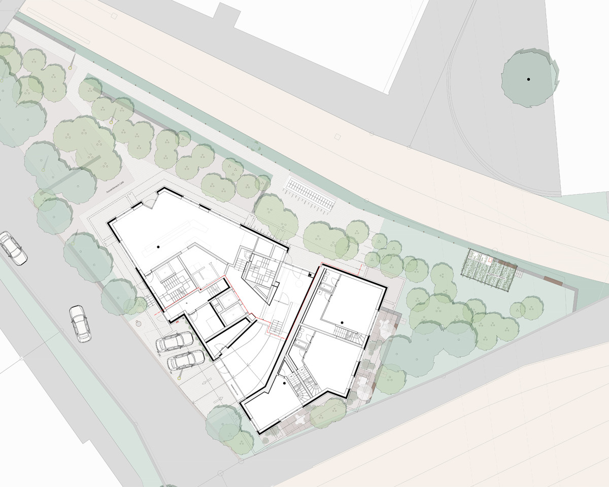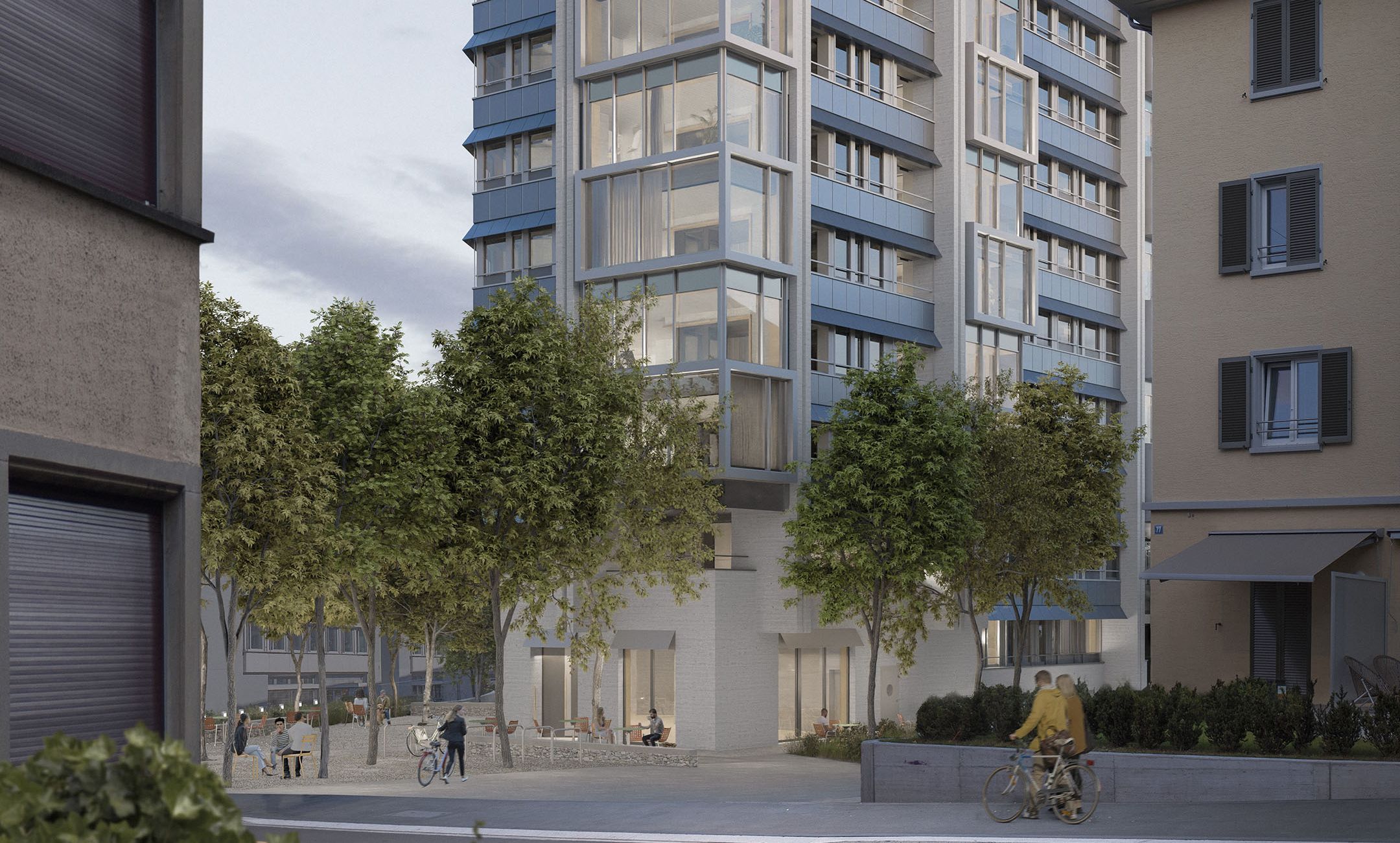 Die zurückversetzte Position des geplanten Wohnhauses schafft einen öffentlich zugänglichen Platz mit schattenspendenden Bäumen, der zum Verweilen einlädt. Ebenfalls zum Projekt gehört eine Gewerbefläche, die direkt an diesen Platz angrenzt.