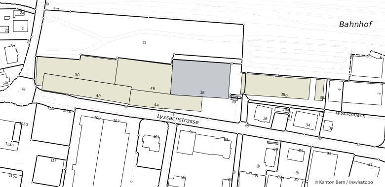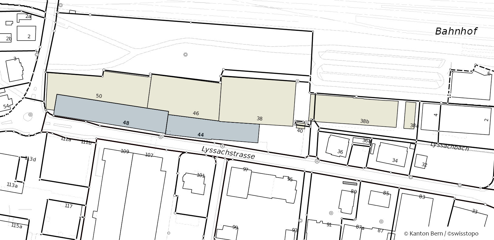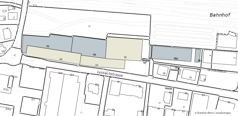 - Rückbau der Gebäude 38a, 38b, 46 und 50 (blaue Markierung)