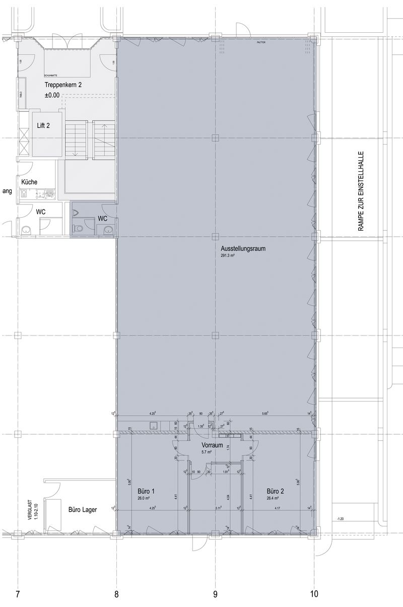 - Repräsentative Ausstellungsfläche mit unterteiltem Bürobereich