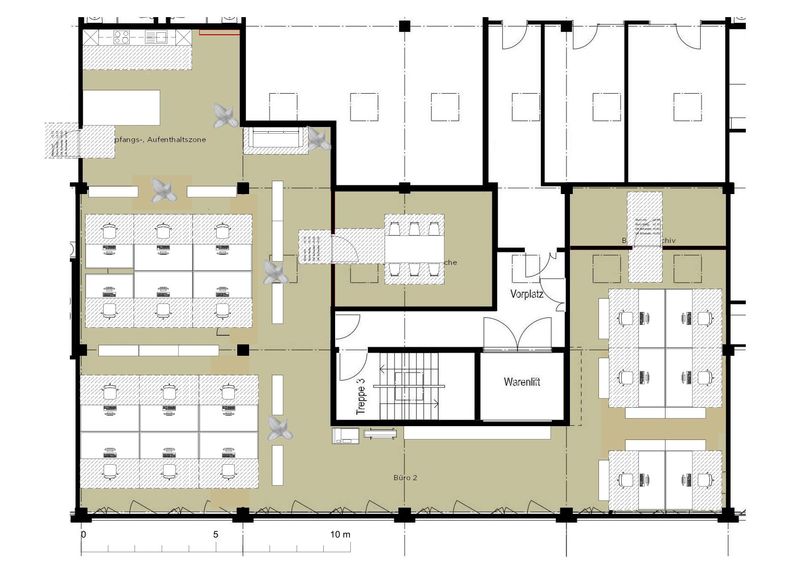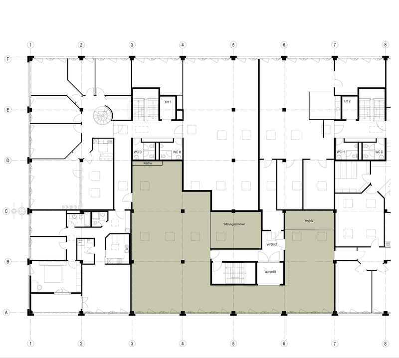 • Ausgebaute Bürofläche (Empfangs-/Aufenthaltszone, Grossraumbüro, Sitzungszimmer, Archivraum)