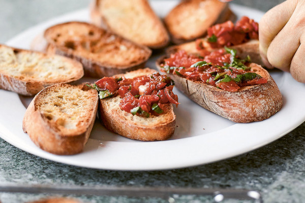 Nicole and Carlo know everyone, but the others are meeting for the first time. Beat and Claudia serve the aperitif at their place: Salami, parmesan and bruschetta, accompanied by white wine and a glorious sunset. The conversation gets going immediately. Pigeon problems, a bathtub with a view and a trip to Albania are discussed. The time flies by.