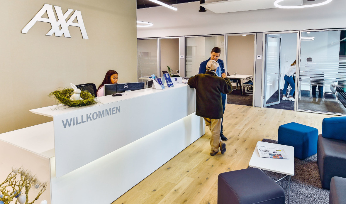 Axa wanted modern open-plan offices along with a welcoming and open space for clients which also included a spacious reception area. In this, they’ve succeeded. A simple yet cheerful design lights up the attractive client area, which serves as both contact and information point.