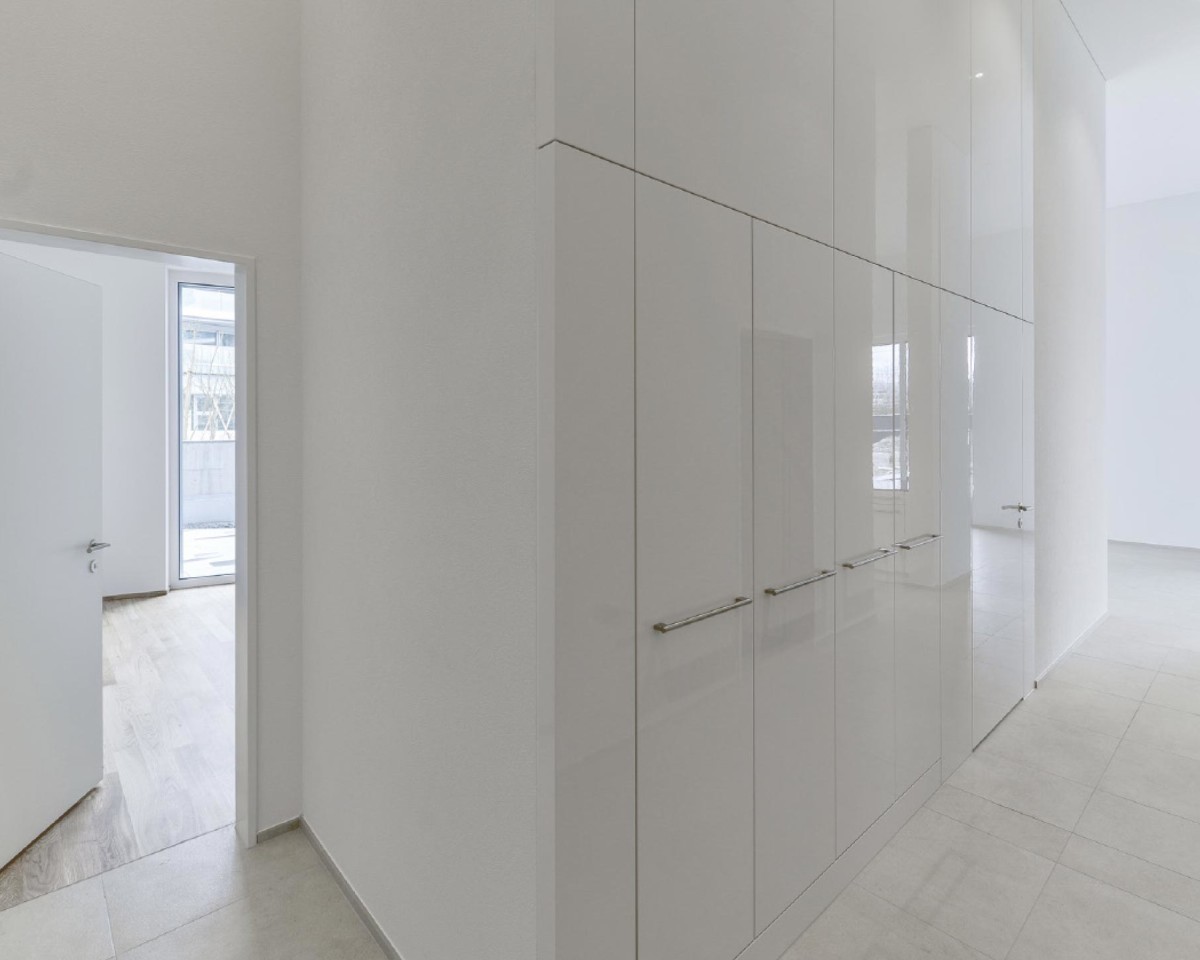 Our apartment designs are open and transparent. In addition, we provide storage rooms and fitted cabinets, as well as intelligent kitchen and bathroom furnishings. Occupants can thus dispense with larger items of storage furniture and so gain space.