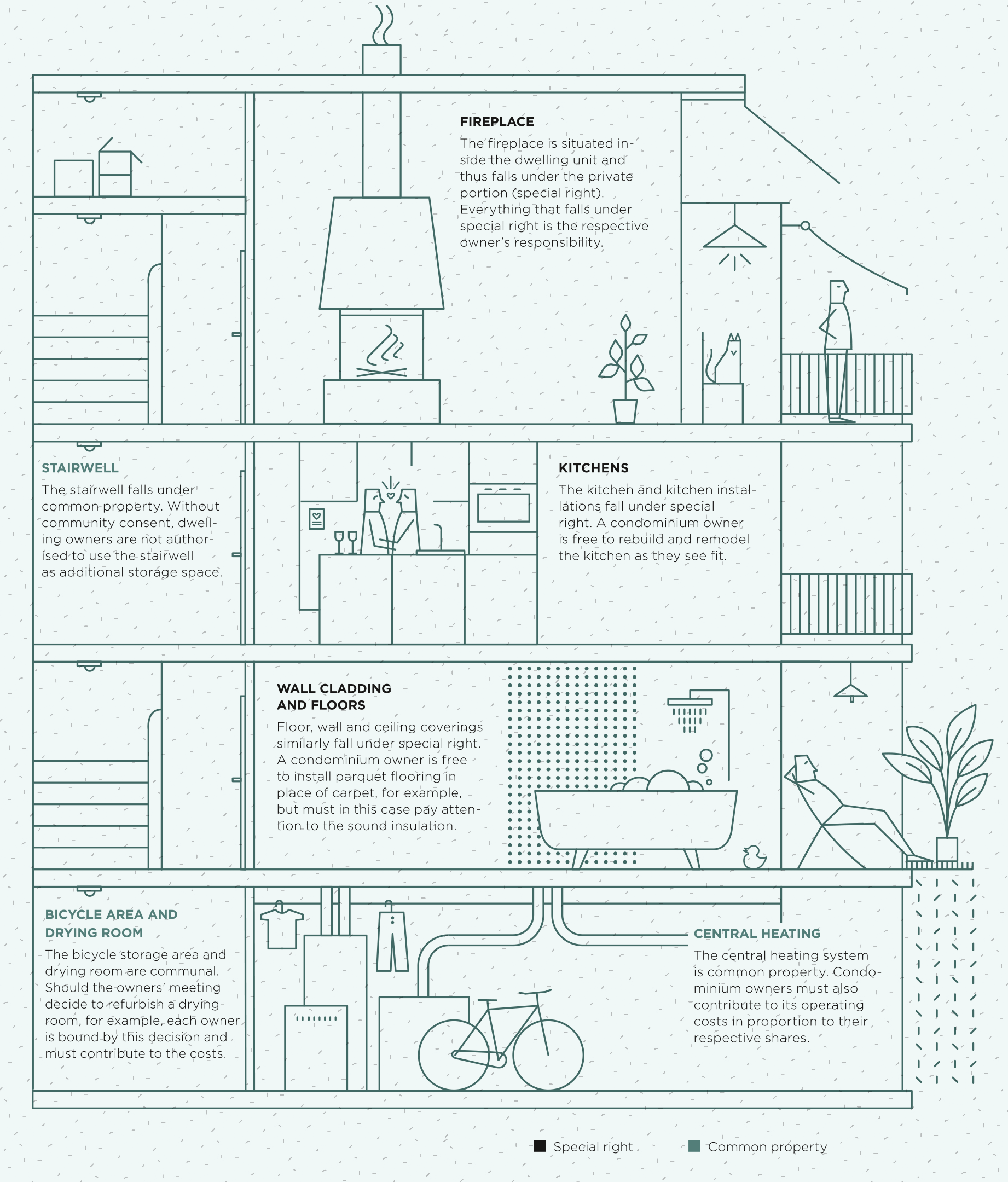 Legally speaking, this form of commonhold ownership has only been possible since 1965. Meanwhile, there are slightly over a million condominium apartments in Switzerland – and the number is growing all the time. It is not immediately clear to everyone who chooses this route that, with the purchase done, they have now become co-proprietors with a special right over their own apartment. This means having to communicate and agree with the other parties, who may well have different interests. But what falls under the special right of use within one's own four walls, and what falls under common property where decisions are majority-based?
