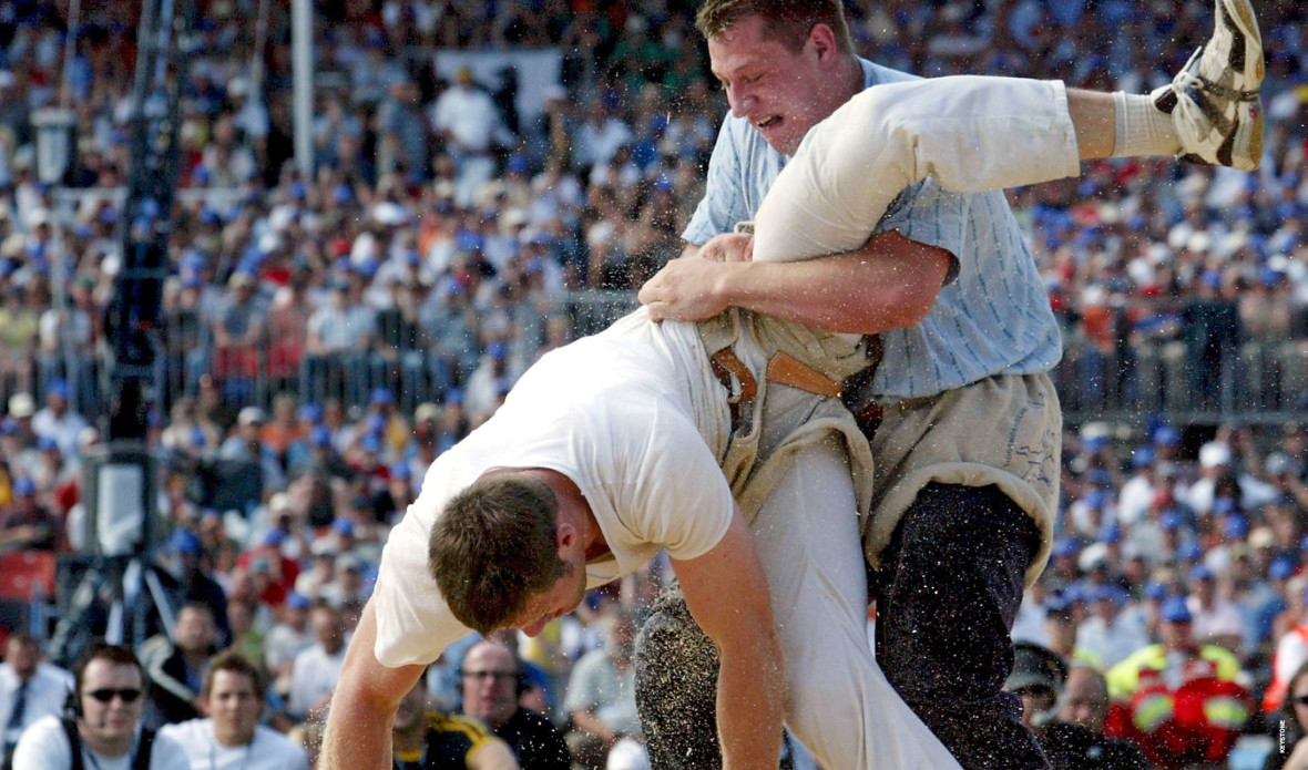 The numbers are impressive: 240,000 litres of beer and 200,000 litres of water were drunk and 60,000 bratwurst sausages grilled at the ESAF in Estavayer. A similar number of spectators is expected to flood into the ESAF in Zug, taking place from 23 to 25 August 2019. But wrestling festivals were not always such large events. Originally, Swiss wrestling was a game to entertain shepherds, Alpine herdsmen and farmers at festivals in Alpine houses and hostelries. And that was a long time ago: the first depiction dates back to the 13th century. Schwingen wrestling gained momentum in 1805 at the Alpine Shepherds’ Festival in Unspunnen. The festival took place at a time when Switzerland was suffering under foreign rule by the French. The aim of the event was to strengthen Swiss national consciousness. A piece of trouser cloth, a sheep or other natural objects were the tempting prizes then. But honour was the main thing; the prize was secondary. That hasn’t changed. To this day, the wrestlers receive no money, but are instead awarded a wreath and can choose from a selection of gifts. On most occasions there is a bull – or its value in cash for the overall winner (or Schwinger king).