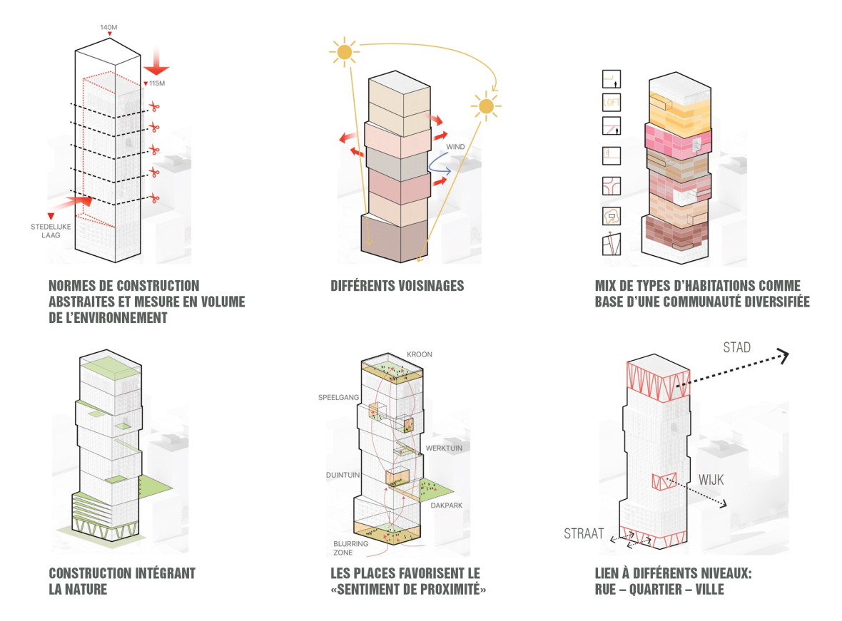 Repenser le voisinage: telle est l’approche très prometteuse du concept de «voisinage vertical» développé par un bureau d’architecture d’Amsterdam, qui est mis en œuvre actuellement dans une construction immobilière à La Haye. Une tour de 115 mètres abritant 200 appartements est en train de sortir de terre. Dans celle-ci, plusieurs étages sont empilés dans un ordre légèrement décalé, comme des blocs de construction, ce qui évite tout voisinage à part entière.