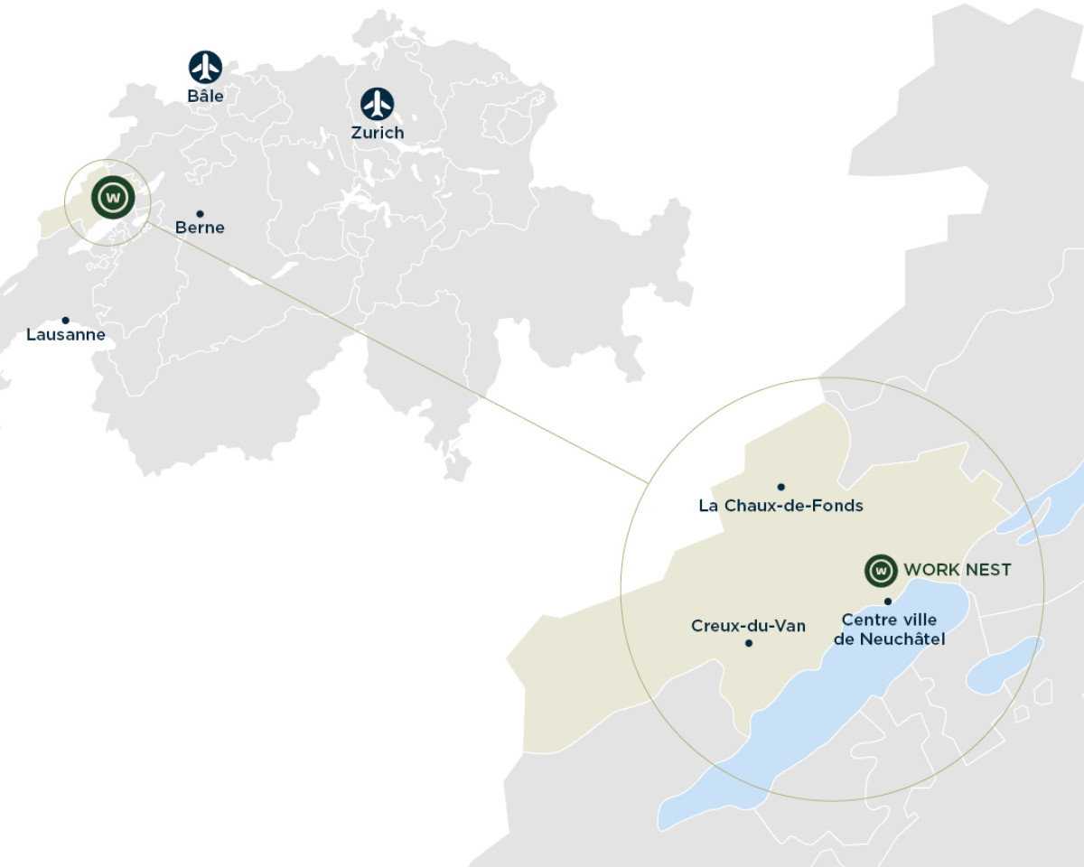 Dans les hauteurs pittoresques au-dessus de Neuchâtel, Work Nest est en train de voir le jour, une oasis de verdure qui combine à la perfection travail et bien-être. Work Nest est situé dans la zone industrielle Pierre-à-Bot, à seulement six minutes du centre-ville de Neuchâtel. Il allie une architecture inspirante à la nature, la flexibilité et la communauté – parfait pour les entreprises qui souhaitent se développer et créer.