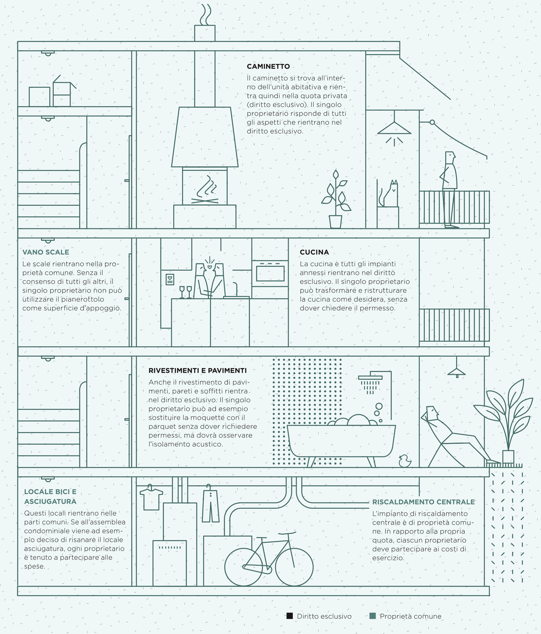 Negli edifici a uso abitativo con proprietà per piani (condomini), il proprietario di un appartamento ha un diritto esclusivo che gli consente di fare delle modifiche in casa propria senza dover richiedere il consenso degli altri proprietari per piani, a condizione di non intaccare la struttura muraria dell’edificio. Per le parti comuni dell’immobile, infatti, i vari proprietari per piani devono mettersi d’accordo. Un’attenta amministrazione assicura una serena convivenza.