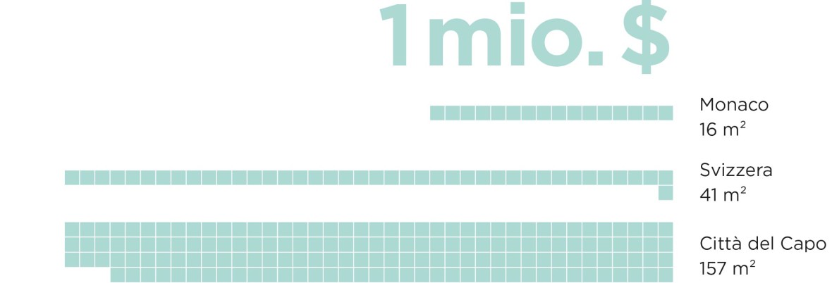 Chi possiede 1 milione di dollari forse sogna di comperarsi un appartamento di lusso. Nella categoria degli immobili premium, per questa somma non si otterrà molto spazio. In Svizzera, mediamente, si potrebbero acquistare 41 metri quadri. Nel Principato di Monaco si arriva appena a 16. Va un po’ meglio a Città del Capo: nella città sudafricana, per un milione si possono acquistare 157 metri quadri.