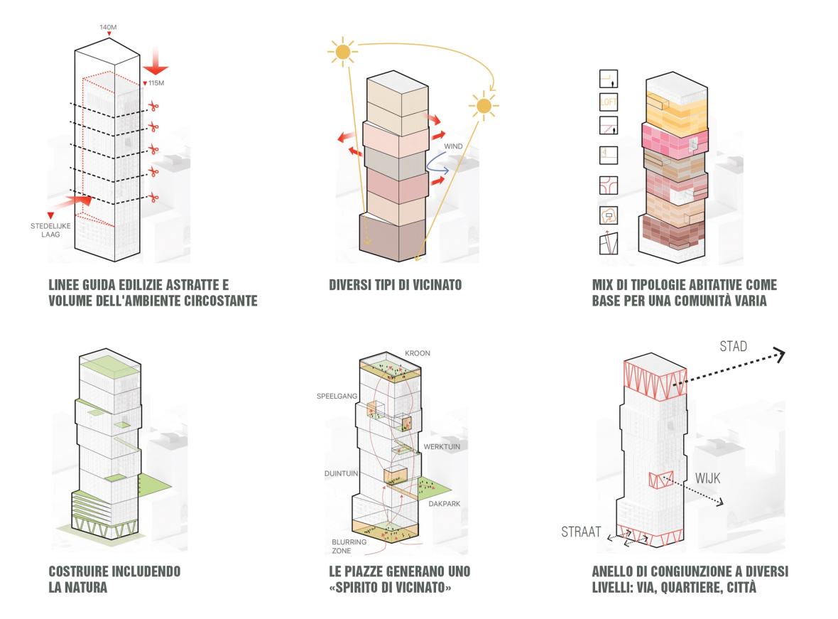 Ripensare il vicinato: è questo l’approccio promettente di un modello di «vicinato verticale», ideato da uno studio architettonico di Amsterdam. Attualmente il modello viene applicato alla costruzione di un grattacielo all'Aia. La costruzione progettata è una torre di 115 m con 200 appartamenti. I vari piani vengono sovrapposti come mattoncini in modo leggermente sfalsato, in modo da creare dinamiche autonome di vicinato.